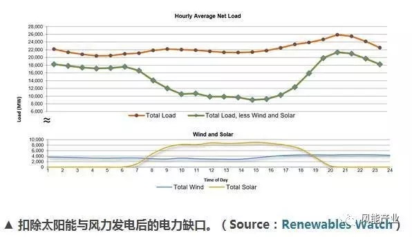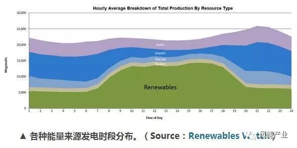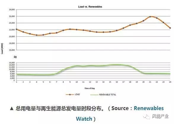 在凌晨時(shí)段,再生能源約可以負(fù)擔(dān)總用電需求的27%,當(dāng)太陽出來后,最高可負(fù)擔(dān)63%,但入夜后發(fā)電量劇降加以用電量驟升,負(fù)擔(dān)比例再度回到23%至27%的水準(zhǔn)。