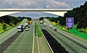 修建“太陽(yáng)能公路”無(wú)需重建公路,只需把一塊塊非常薄的太陽(yáng)能板像地磚一樣鋪在道路表面,并在上層加蓋由樹脂材料制成的高強(qiáng)度透明板即可。它可以將太陽(yáng)能轉(zhuǎn)化為電能,再通過地面以下的輸電裝置將電能輸送到城市電網(wǎng)。