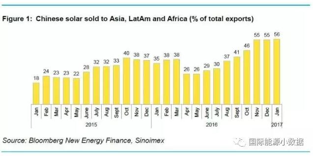 中國儲(chǔ)能網(wǎng):中國光伏產(chǎn)品出口的主要市場(chǎng)已經(jīng)開始從發(fā)達(dá)國家逐步轉(zhuǎn)移到發(fā)展中國家。根據(jù)彭博新能源財(cái)經(jīng)(BNEF)的數(shù)據(jù),2017年1月份中國光伏產(chǎn)品對(duì)亞非拉的出口已經(jīng)占到56%,而2015年1月這個(gè)份額僅為18%。
