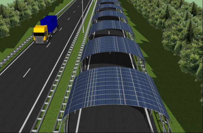 架空式太陽能光伏公路充分利用公路路面上層立體空間,在公路行車路面的上方建設(shè)適當(dāng)高度的太陽能光伏發(fā)電廊道,在產(chǎn)生電能的同時(shí)集公路線形誘導(dǎo)、輔助照明、智能監(jiān)控等功能于一體,是新型的公路交通基礎(chǔ)設(shè)施。