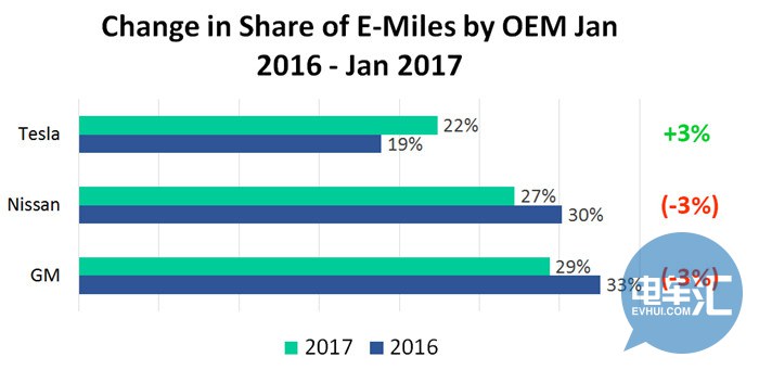 綜合報告數(shù)據(jù),通用汽車以及日產(chǎn)汽車從2012年起就開始保持了平穩(wěn)的增長速度。但伴隨著Model S和Model X的陸續(xù)推出,特斯拉僅在2016-2017年的不到兩年內(nèi),就躋身美國電動汽車累積行駛里程的前三甲,并迅速處于行業(yè)領(lǐng)先地位。從2016年1月份到2017年,特斯拉的電動行駛里程的份額上漲了3%,而日產(chǎn)以及通用汽車的份額均下降了3%。