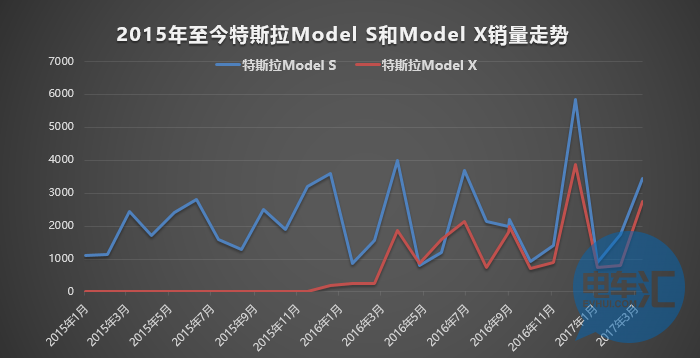 如下圖顯示,2016年3月之后,Model X市場表現(xiàn)變得強勁;2016年末銷量達到了峰值,月銷量接近4000。
