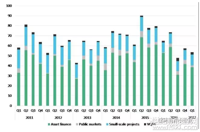 中國儲能網(wǎng)訊:根據(jù)彭博新能源財經(jīng)(BNEF)公布的最新數(shù)據(jù),2017年第1季度全球可再生能源投資總額536億美元,比2016年第1季度下降17%,相比2016年第4季度也下降了7%。全球可再生能源投資的兩個最大的市場——中國和美國表現(xiàn)不佳:美國投資為94億美元,下降24%;中國投資為172美元,下降11%。此外,印度這一期間可再生能源24億美元,下降2%。