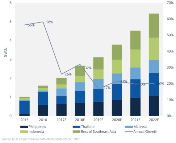 報告還強(qiáng)調(diào)泰國和馬來西亞等東南亞國家的潛在增長機(jī)會。GTM預(yù)計,由于慷慨和日益增加的清潔能源關(guān)稅,2017-2022年,泰國的新增太陽能容量將超4.6吉瓦。