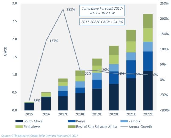 撒哈拉以南非洲對開發(fā)商展現(xiàn)了10吉瓦的機(jī)會。2016年,南非、津巴布韋、肯尼亞和納米比亞至少投運了10個公共事業(yè)規(guī)模項目。展望未來,GTM預(yù)計2017年撒哈拉以南非洲將實現(xiàn)近1吉瓦的并網(wǎng)容量,并有可能到2022年新增太陽能裝機(jī)量超10吉瓦。