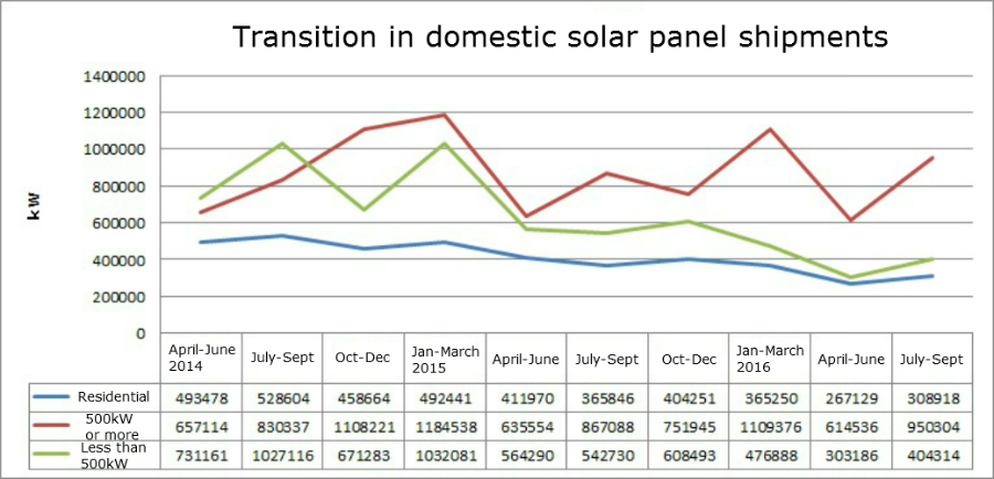 中國儲能網(wǎng)訊:自2012年日本祭出“再生能源特別措施法案”高價收購太陽能發(fā)電以來,日本光伏市場發(fā)展迅猛。不過隨著日本逐年調(diào)降太陽能收購價格,市場衰退趨勢明顯。2016年受內(nèi)需萎縮影響,日本光伏市場已連續(xù)7季衰退,相關(guān)企業(yè)相繼敗退、破產(chǎn)件數(shù)更創(chuàng)歷史新高。