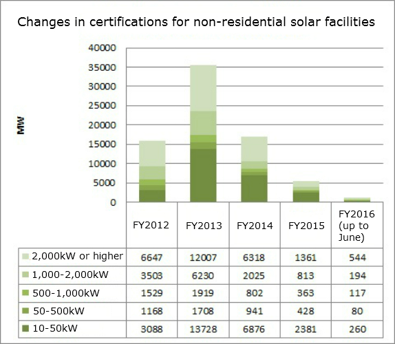 盡管2016年度對非住宅太陽能發(fā)電設(shè)施的新認(rèn)證可能只有3GW,但重點(diǎn)在于這個數(shù)字是否會進(jìn)一步下降或增加。這個數(shù)字將決定日本太陽能發(fā)電行業(yè)的真正市場。而在FIT計(jì)劃初期認(rèn)定的項(xiàng)目完成后,預(yù)計(jì)非住宅太陽能發(fā)電市場(包括大型太陽能發(fā)電廠)將非常重要。