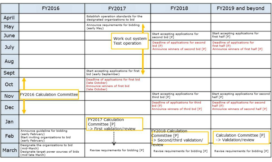 招標(biāo)制度的引入是修改FIT計(jì)劃的重大變化之一。日本經(jīng)濟(jì)產(chǎn)業(yè)省將招標(biāo)對象限制在2MW以上的特種高壓項(xiàng)目中,2018年度將進(jìn)行兩次招標(biāo),其中2017財年和2018財年作為試用期。