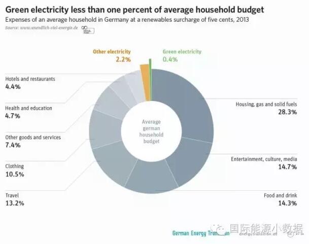 那么,為什么德國(guó)百姓承擔(dān)高昂電費(fèi)情況下卻依然對(duì)能源轉(zhuǎn)型給予支持呢?原來(lái),從德國(guó)家庭平均支出構(gòu)成來(lái)看,雖然說(shuō)電價(jià)因?yàn)榭稍偕茉锤郊淤M(fèi)而變得更貴了,但是德國(guó)人收入較高,可再生能源加價(jià)僅占家庭支出的0.4%。相比其他開(kāi)支,比如娛樂(lè)14.7%、旅行13.2%,綠色電力這0.4%值了。