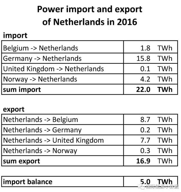 如下表所示,2016年荷蘭進口22 TWh(220億千瓦時),其中15.8 TWh來自德國、4.2TWh來自挪威,來自英國的進口可以忽略不計。同時,2016年荷蘭出口16.9 TWh,其中8.8 TWh流向比利時、7.7 TWh流向英國。進出口來龍去脈兩相比較,可以看出德國的風電光伏相當一部分是經(jīng)過荷蘭去了英國。