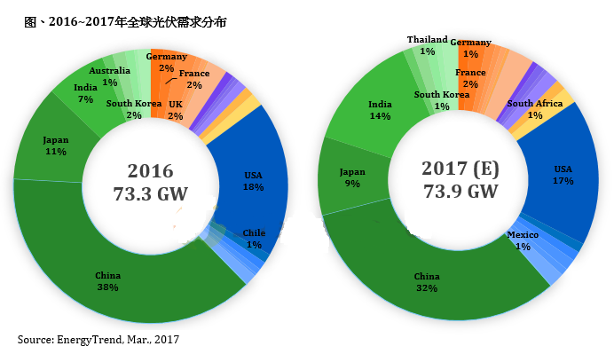 EnergyTrend分析師蔡旻純表示,由于中國(guó)目前公布之2017年光伏裝機(jī)目標(biāo)略低于去年,加上美國(guó)政策恐不利于光伏發(fā)展、日本躉購(gòu)費(fèi)率(Feed-in-Tariff)持續(xù)下調(diào)等因素,讓需求強(qiáng)勁成長(zhǎng)中的印度有望取代日本成為需求第三大國(guó),占全球比重達(dá)14%。