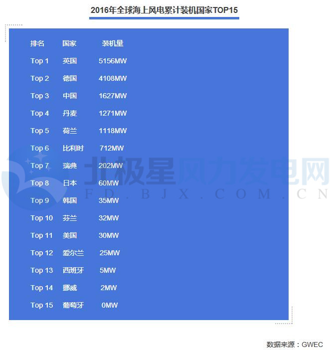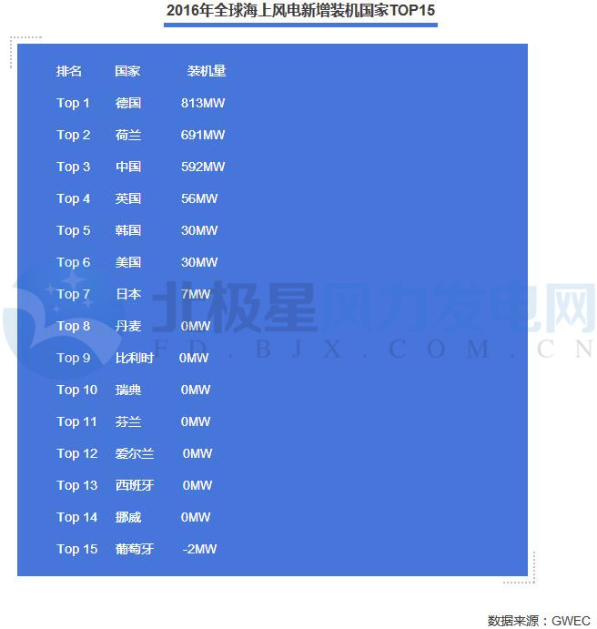 1、2016年全球海上風電增長勢頭仍然由德國引領,但坐全球海上風電累計裝機“頭把交椅”的仍然是英國;