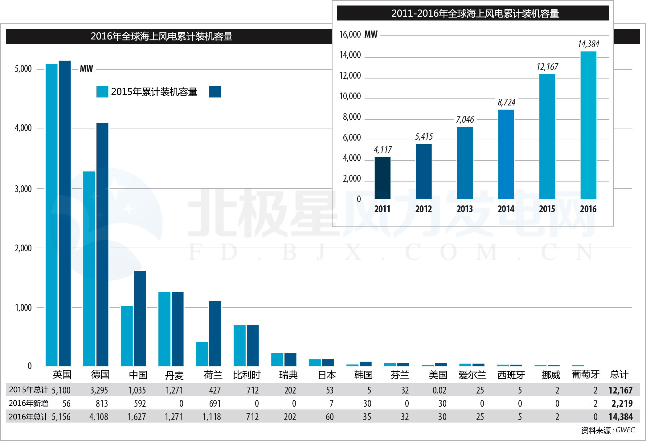 2016全球海上風電新增&累計裝機容量圖