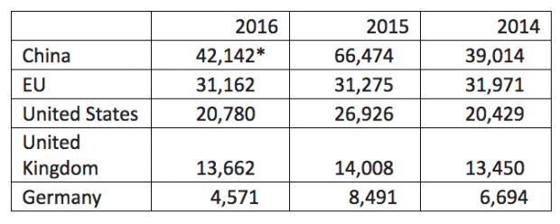報(bào)告作者解釋說:“中國(guó)上榜企業(yè)數(shù)量的減少與中國(guó)企業(yè)清潔能源業(yè)務(wù)上的收益下降關(guān)系不大。這71家企業(yè)的總清潔能源收益為432億美元,而在去年8月的榜單上為437億美元?!?