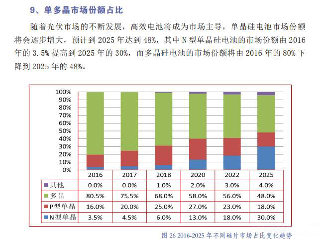 《路線圖》第三部分,產(chǎn)業(yè)鏈各環(huán)節(jié)關(guān)鍵指標(biāo)—硅片環(huán)節(jié)—單多晶市場(chǎng)份額占比中描述:隨著光伏市場(chǎng)的不斷發(fā)展,高效電池將成為市場(chǎng)主導(dǎo),單晶硅電池市場(chǎng)份額將會(huì)逐步增大,預(yù)計(jì)到2025年達(dá)到48%,其中N型單晶硅電池的市場(chǎng)份額由2016年的3.5%提高到2025年的30%,而多晶硅電池的市場(chǎng)份額將由2016年的80%下降到2025年的48%。
