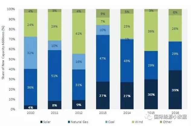 太陽(yáng)能光伏首次成為各種電源中新增裝機(jī)最多的電源,占到2016年美國(guó)新增裝機(jī)容量的39%,其次是天然氣(29%)、風(fēng)電(26%)。目前美國(guó)各種規(guī)模的太陽(yáng)能光伏電站(設(shè)施)超過(guò)130萬(wàn)個(gè),累計(jì)裝機(jī)超過(guò)40吉瓦。
