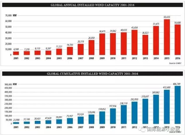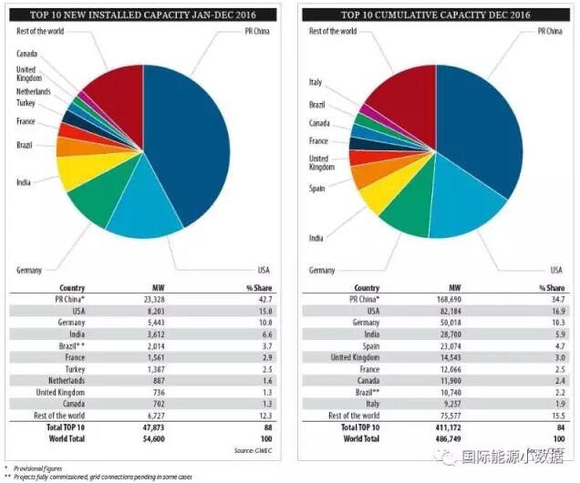 至2016年底,全球風(fēng)電累計(jì)裝機(jī)達(dá)到486.7吉瓦,排在前10名的國(guó)家是:中國(guó)(168.69吉瓦,34.7%)、美國(guó)(82.18吉瓦,16.9%)、德國(guó)(50.0吉瓦,10.3%)、印度(28.7吉瓦,5.9%)、西班牙(23.1吉瓦,4.7%)、英國(guó)(14.5吉瓦,3.0%)、法國(guó)(12.1吉瓦,2.5%)、加拿大(11.9吉瓦,2.4%)、巴西(10.7吉瓦,2.2%)、意大利(9.3吉瓦,1.9%),世界其他國(guó)家風(fēng)電裝機(jī)為75.6吉瓦,占15.5%。