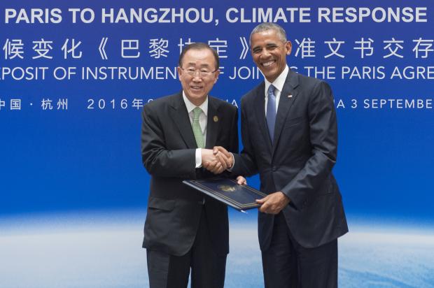 2016年時(shí)任美國總統(tǒng)奧巴馬與潘基文在杭州共同出席氣候變化《巴黎協(xié)定》批準(zhǔn)文書交存儀式。圖片來演:UN Photo/Eskinder Debebe