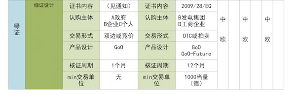 表中依據(jù)圖一思路做了中歐能源體系中主要分支羅列對(duì)比,以及綠色證書設(shè)計(jì)的一些不同之處,并且將各項(xiàng)指標(biāo)按照完成度、關(guān)聯(lián)性和可延展性進(jìn)行大致分級(jí),綠色的深淺表示各對(duì)比項(xiàng)的完成情況。