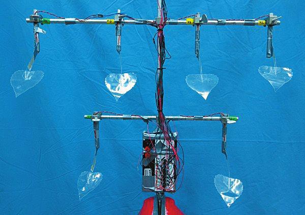 McCloskey實(shí)驗(yàn)室的仿生樹風(fēng)力發(fā)電裝置的原型不是真的樹,而是將十二個(gè)楊樹葉形狀的塑料皮瓣掛在 一個(gè)金屬棚架上,其莖葉內(nèi)有小型特殊塑料條,當(dāng)它被流動(dòng)的空氣彎曲時(shí),可以釋放出電荷,這個(gè)過程被稱為壓電效應(yīng)。將楊樹葉子作為藍(lán)本是因?yàn)槠浔馄降娜~柄可以迫使葉片規(guī)律地振蕩,通過柔性壓電片,充分利用風(fēng)能,優(yōu)化發(fā)電效率。