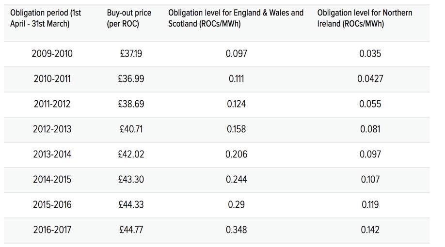 這里涉及到了一個(gè)市場(chǎng)供需關(guān)系問(wèn)題。如果市場(chǎng)上的ROC供應(yīng)數(shù)量大于其強(qiáng)制購(gòu)買要求,那么證書(shū)的價(jià)格必然會(huì)被打壓。所以ofgem會(huì)根據(jù)預(yù)測(cè)發(fā)電量上浮10%來(lái)設(shè)定ROC購(gòu)買需求。這樣又不會(huì)造成ROC大量短缺,從而保證一定程度的市場(chǎng)競(jìng)爭(zhēng),穩(wěn)定證書(shū)價(jià)格。下表(引自ofgem)中間一欄描述了過(guò)去八年的ROC單位用電要求。我們可以看到這一標(biāo)準(zhǔn)從09年的0.097每兆瓦時(shí)上升至了16年的0.348每兆瓦時(shí)。反映了英國(guó)可再生能源發(fā)電比例的不斷上升。也側(cè)面說(shuō)明了售電商在購(gòu)買牌照方面的開(kāi)銷在不斷增大。