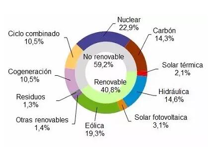 中國儲能網(wǎng)訊:根據(jù)西班牙電網(wǎng)公司REE公布的數(shù)據(jù),2016年西班牙發(fā)電量中有40.8%來自可再生能源(遠遠高于德國的29.5%),其中風電占比高達19.3%,水電占14.6%,光伏占3.1%,光熱占2.1%。非可再生能源發(fā)電量占比59.2%,其中核電占22.9%,天然氣發(fā)電(含工業(yè)熱電聯(lián)產(chǎn))占21%,煤電占14.3%。