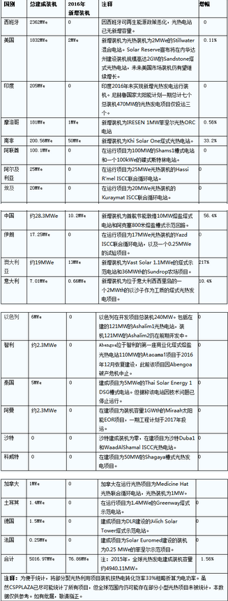 中國市場2016年表現(xiàn)搶眼,總的新增裝機(jī)量為10.2MW。包括12月26日并網(wǎng)發(fā)電的首航節(jié)能敦煌10MW熔鹽塔式電站,以及10月12日并網(wǎng)投運(yùn)的甘肅阿克塞800米熔鹽槽式示范回路,裝機(jī)200kW。這使得中國光熱發(fā)電的總建成裝機(jī)達(dá)到28.3MW。雖然中控德令哈10MW熔鹽塔電站于2016年8月20日并網(wǎng)發(fā)電,但因該項(xiàng)目是基于此前的10MW水工質(zhì)項(xiàng)目的改造工程,故這一新增裝機(jī)量不列入2016年的新增裝機(jī)統(tǒng)計(jì)。