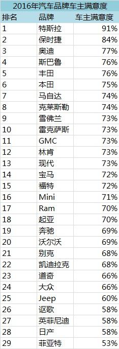 在29個汽車品牌中,菲亞特為最后一名,僅有53%的車主滿意度,謳歌、英菲尼迪和日產的滿意度也在60%以下。主要銷售皮卡和廂式貨車的Ram從去年的第5名一路跌至17名,寶馬從去年的第6名下降至14名,大眾更是降到倒數第6名。