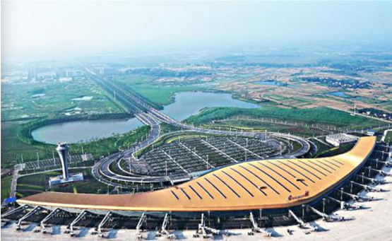 合肥新橋機(jī)場(chǎng)在2013年5月30日正式啟用,屋面采用金黃色的直立鎖邊鋁鎂錳合金面板,規(guī)律設(shè)置19排屋面采光天窗。俯視整個(gè)建筑,宛若金色的展翅大鵬在江淮分水嶺上昂首欲飛,既是一張代表合肥形象的新“名片”,也是安徽又一標(biāo)志性新景觀。該機(jī)場(chǎng)分布式光伏發(fā)電項(xiàng)目貫徹節(jié)能減排理念,在優(yōu)化能源系統(tǒng)運(yùn)行效率的同時(shí),有效推動(dòng)了合肥市“中國光伏應(yīng)用第一城”的構(gòu)建,促進(jìn)我國“綠色機(jī)場(chǎng)”的可持續(xù)發(fā)展。