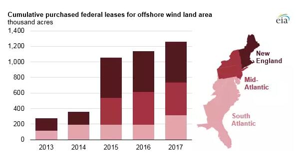 早在2013年,美國海洋能源管理局就首次舉行了海上風(fēng)電場建設(shè)用地出租的商業(yè)化競標,此次出租的海上風(fēng)電場建設(shè)用地位于羅德島州及馬薩諸塞州海岸線上,總面積達165000英畝。在這之后,海洋能源管理局又在大西洋海域進行了四次競標。據(jù)數(shù)據(jù)統(tǒng)計,到目前為止,在聯(lián)邦海域一共有11個商業(yè)化租賃模式的海上風(fēng)電場項目,其中9個都是通過競標的方式達成的。自2013年以來,已經(jīng)累計有一百萬英畝的海洋面積被出租用于海上風(fēng)電場建設(shè)。