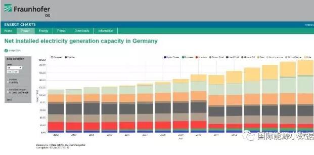 根據(jù)德國(guó)Fraunhofer整理的最新數(shù)據(jù),2016年德國(guó)電力總裝機(jī)容量達(dá)194.53GW,其中太陽(yáng)能40.41GW、海上風(fēng)電4.13GW、陸上風(fēng)電44.80GW、天然氣28.27GW、燃油4.19GW、硬煤28.38GW、褐煤20.90GW、核電10.80GW、生物質(zhì)7.06GW、水電5.59GW。與2015年相比,太陽(yáng)能裝機(jī)凈增1.08GW、陸上風(fēng)電凈增3.55GW、海上風(fēng)電凈增0.70GW,與往年相比太陽(yáng)能光伏裝機(jī)增長(zhǎng)速度已經(jīng)大大下降。