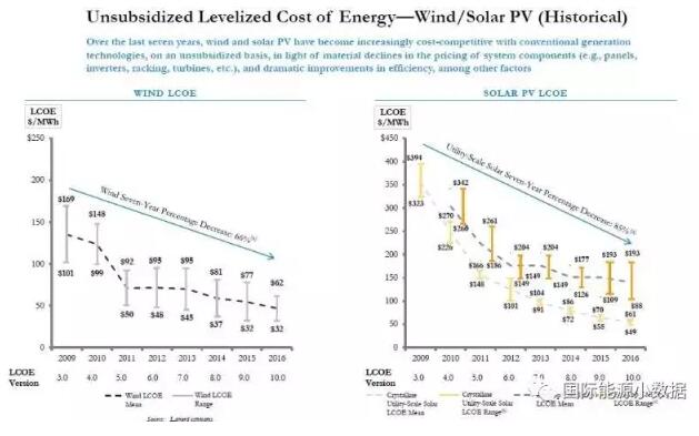 中國儲(chǔ)能網(wǎng)訊:美國咨詢公司Lazard每年評(píng)估美國各類能源發(fā)電的全生命周期平準(zhǔn)成本(LCOE),2016年12月15日公布了第10份報(bào)告。這份報(bào)告中的一幅圖表顯示了2009年以來美國風(fēng)電、光伏成本的下降趨勢(shì)。