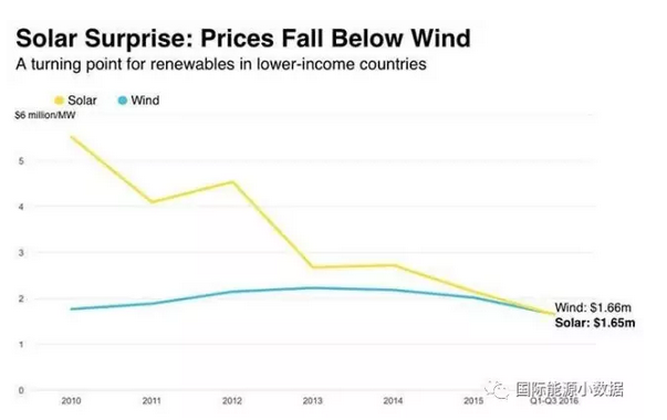 中國儲能網(wǎng)訊:人們常常把風電光伏成本與常規(guī)能源相比,那么風電和光伏本身成本相比是什么樣的情況呢?據(jù)彭博新能源財經(jīng)在包括中國、印度、巴西等58個發(fā)展中國家的調(diào)查統(tǒng)計,截至2016年第三季度這些國家中太陽能光伏項目投資的平均報價為1.65美元/瓦,而風電項目投資的平均報價為1.66美元/瓦。光伏投資成本僅在5年前還高出風電2倍,現(xiàn)在首次略低于風電,可謂是歷史的飛躍。