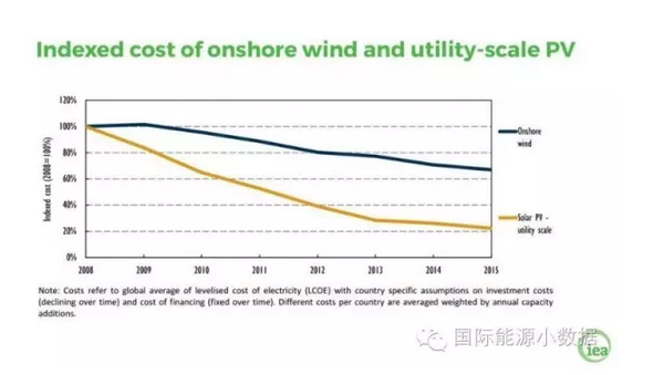 中國儲能網(wǎng)訊:根據(jù)國際能源署的數(shù)據(jù),2008年至2015年全球陸上風(fēng)電的度電平準(zhǔn)成本(levelized cost of electricity,考慮設(shè)備投資、融資成本,各國數(shù)據(jù)加權(quán)平均)下降了35%,而同期地面光伏電站的度電平準(zhǔn)成本下降了80%。