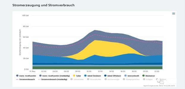這天也是個(gè)公休日,負(fù)荷較低,而風(fēng)光都出力很好。曾有多個(gè)媒體報(bào)道:“2014年5月11日,這一天的中午時(shí)分,德國(guó)的光伏、風(fēng)電出力高達(dá)當(dāng)時(shí)負(fù)荷的74%”。經(jīng)多方核實(shí),這個(gè)數(shù)據(jù)有問題。