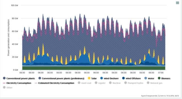 這天是個(gè)星期天,用電負(fù)荷低于工作日,風(fēng)電光伏都大發(fā),創(chuàng)造了記錄。這天的數(shù)據(jù)我此前做過一次計(jì)算,但錯(cuò)誤地計(jì)算成了88%,特此向讀者們致歉。德國(guó)2016年1-5月可再生能源發(fā)電情況.最高時(shí)段88%。