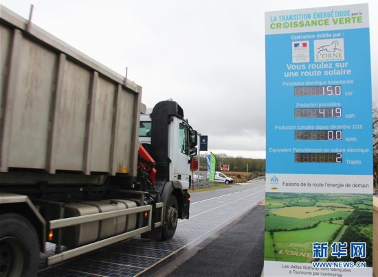 12月22日,一輛貨車(chē)行駛在法國(guó)西北部圖魯夫爾歐佩爾什鎮(zhèn)的“太陽(yáng)能公路”上。