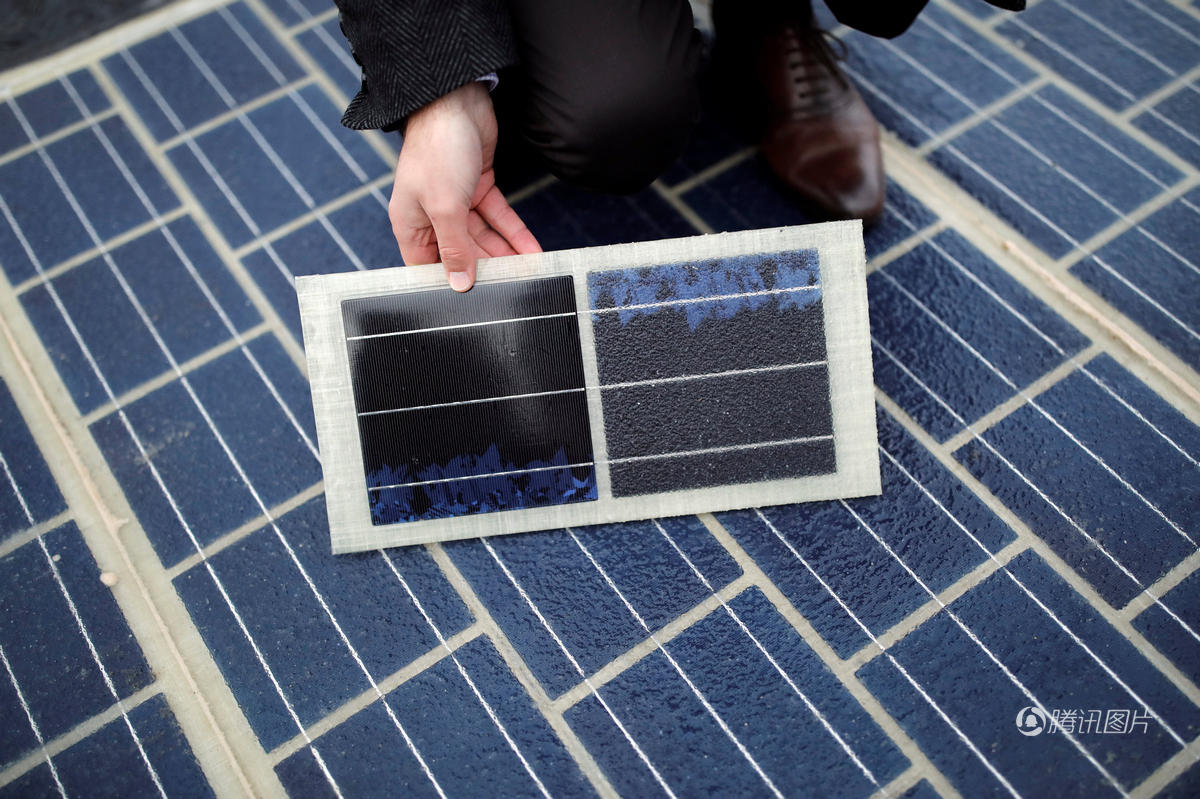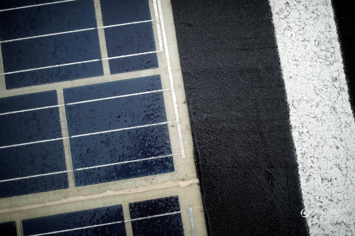 工程人員在涂滿泊油的路上,鋪了幾千米的太陽(yáng)能面板。其脆弱的光伏板被一種混合聚酯層保護(hù)著,可以經(jīng)得起汽車及各種輕重型車輛經(jīng)常的往來(lái)路壓。這種半透明的混合材質(zhì)可以讓陽(yáng)光透過(guò)去,被硅分子吸收進(jìn)去。