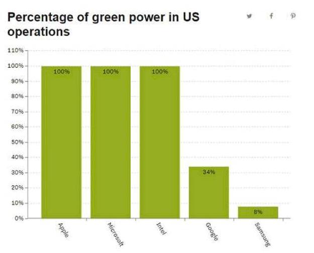 蘋果一直標榜互聯(lián)網(wǎng)科技公司,而現(xiàn)在在前面加上環(huán)保二字一點也不為過。連續(xù)兩年在綠色和平組織的清潔能源指數(shù)排行榜上獲得滿分,排名第二的雅虎僅得分73,其他硅谷企業(yè)更是連及格都沒達到,甚至曾經(jīng)苛責蘋果的綠色和平組織也對其繞開電力公司、直接建立自己的可再生能源設施的做法大加贊賞。
