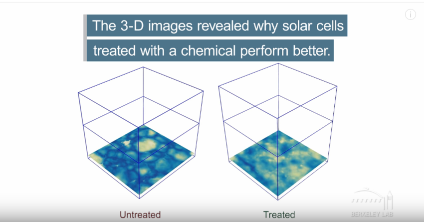 (3D圖像顯示,加入某化學(xué)物質(zhì)后,太陽(yáng)能電池的效率顯著提升 來(lái)源:Berkeley Lab)