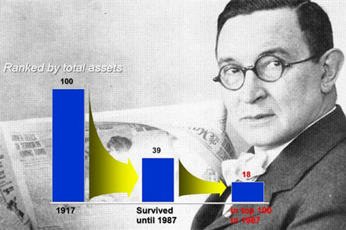 當(dāng)時(shí),他就統(tǒng)計(jì)了在美國的100家公司,大家可以想象一下:那是在1917年,任何人對(duì)整個(gè)經(jīng)濟(jì)的大環(huán)境都沒有多少了解,當(dāng)時(shí)沒有所謂的大數(shù)據(jù),而美聯(lián)儲(chǔ)才在四年之前剛剛建立,掌握的信息還很少,而且美國政府還沒有所謂的公司所得稅記錄制度,但福特還是克服困難,統(tǒng)計(jì)了美國排名前100的大型公司。他想預(yù)計(jì)在未來的四五年中,有哪些政治和經(jīng)濟(jì)的因素會(huì)影響到這些公司的生存率。