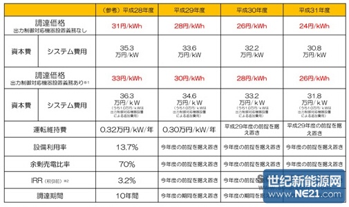 另外,自下年度起,將每次性確定3年的住宅用系統(tǒng)收購價(jià)格。無設(shè)置輸出功率控制設(shè)備義務(wù)的系統(tǒng),2017年度為28日元/kWh,2018年度為26日元/kWh,2019年度為24日元/kWh;有設(shè)置義務(wù)的系統(tǒng)在此基礎(chǔ)上分別高2日元。