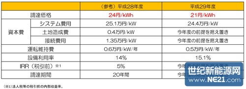 非住宅用系統(tǒng)的收購價(jià)格從本年度的24日元/kWh,降到了21日元/kWh。作為計(jì)算前提的成本和設(shè)備利用率,系統(tǒng)費(fèi)用從25.1萬日元/kW降至24.4萬日元/kW,設(shè)備利用率則從14%提高到15.1%,成為了下調(diào)價(jià)格的依據(jù)。