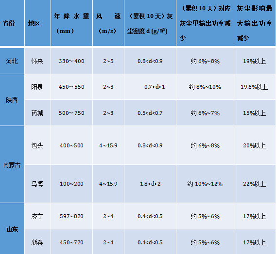 備注:0<d<0.7g/㎡時候,減少率從0迅速增加為7.4%;當(dāng)1g/㎡<d時,減少率逐漸趨緩;d達(dá)到4g/㎡時,減少率增加到12.2%;當(dāng)d>4g/㎡時,輸出功率減小率趨勢更緩。