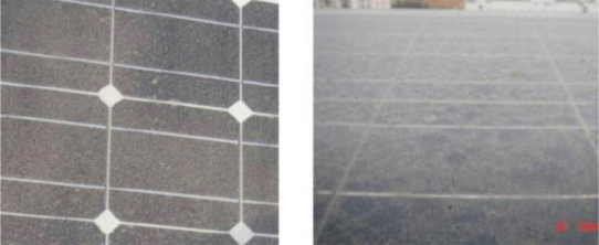 隨著光伏上網(wǎng)電價的大幅下降,沙塵和工業(yè)污染對于光伏電站收益率的影響不斷增大,在個別地區(qū)甚至已成為制約光伏電站建設(shè)開發(fā)的核心因素。表格1是“領(lǐng)跑者”基地灰塵對于光伏電站輸出電量的影響情況,可以看到,如果缺少必要防塵的措施,電站收益將“損失慘重”,特別是在內(nèi)蒙古烏海地區(qū),由于當(dāng)?shù)毓I(yè)污染嚴(yán)重,很容易產(chǎn)生類似“板結(jié)”的現(xiàn)象,專業(yè)解釋為“粘結(jié)積灰”(見下圖)。這類污染粘性和硬度很大,自然力量難以清除,需要較大的人為外力清除,這不僅影響電站發(fā)電量,還會增加電站運(yùn)維成本。因此,越來越多的電站開發(fā)商開始選擇帶有SSG自清潔膜層的光伏組件,來保證電站收益率。