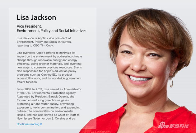 麗莎-杰克遜(Lisa Jackson)曾是奧巴馬總統(tǒng)的內(nèi)閣成員,美國國家環(huán)境保護(hù)局第十二任執(zhí)行長官(相當(dāng)于環(huán)保部部長),蘋果公司在2013年聘請她主管公司環(huán)境部門,任蘋果公司環(huán)境、政策、社會事務(wù)副總裁。