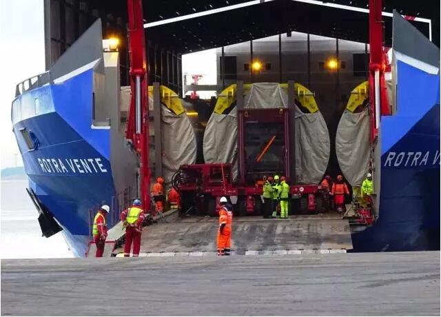 這艘長141米、寬20米的Rotra Vente號滾裝船具有定制化的船頭和可擴展的斜坡,使得機組大部件在甲板區(qū)的裝卸更加便利。