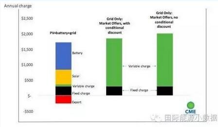那么,在澳大利亞,使用“光伏+特斯拉電池+電網(wǎng)”供電與單純從電網(wǎng)購電從成本上看是否劃算呢?我們以南澳首府阿德萊德為例,假設(shè)居民每年用電量為4800千瓦時,安裝5KW光伏系統(tǒng)(20年壽命,初投資20%的運維成本),電池儲能Powerwall安裝花費10,300美元(壽命10年)。全年運行光伏發(fā)電8,373千瓦時,其中3773千瓦時賣給電網(wǎng),僅在儲能容量不足的情況下從電網(wǎng)買電200千瓦時。這樣算下來,“光伏+特斯拉電池+電網(wǎng)”供電成本已經(jīng)略低于全部從電網(wǎng)購電,用“光伏+儲能”就基本可以滿足需求。