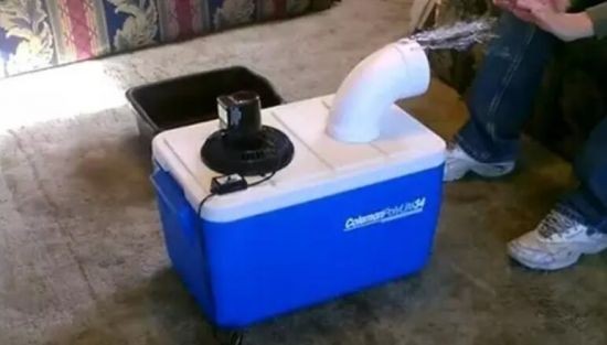 整個(gè)制作過(guò)程只需15分鐘。首先,desertsun02使用電鋸在塑料箱頂部開(kāi)了兩個(gè)孔,其尺寸需要與PVC管和小風(fēng)扇保持一致。隨后,他在塑料箱中放入冰塊,并將風(fēng)扇朝向塑料箱內(nèi)部。該風(fēng)扇不僅可以使用太陽(yáng)能供電,還連接到一個(gè)電池組。desertsun02表示,電池組能使用7小時(shí)時(shí)間,而冰塊融化時(shí)間約為5小時(shí)。