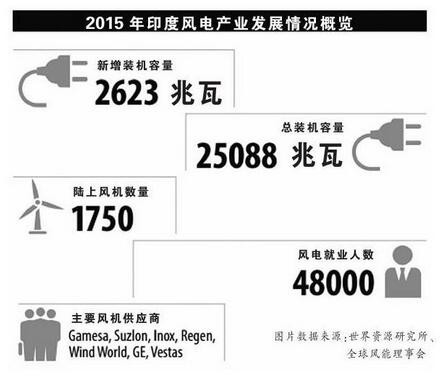 據(jù)全球風(fēng)能理事會(huì)(GWEC)發(fā)布相關(guān)數(shù)據(jù)顯示,2015年印度繼續(xù)保持著亞洲第二大風(fēng)能市場的位置,超越西班牙在累積裝機(jī)容量上排名全球第四,新增風(fēng)電裝機(jī)容量2623兆瓦,累積容量25088兆瓦。